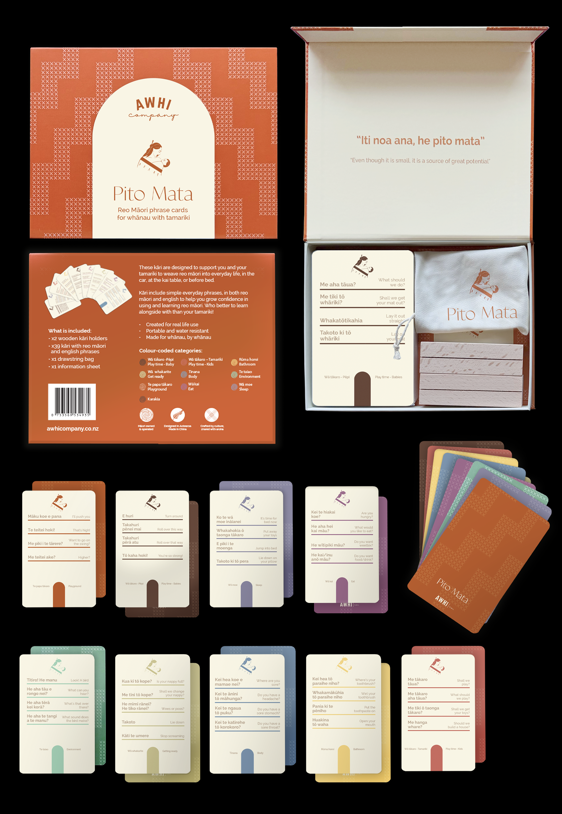 These kāri were designed to support the everyday use of te reo Māori within the home. The aim was to create a practical, easy-to-use tool that integrates naturally into daily routines with pēpi and tamariki.