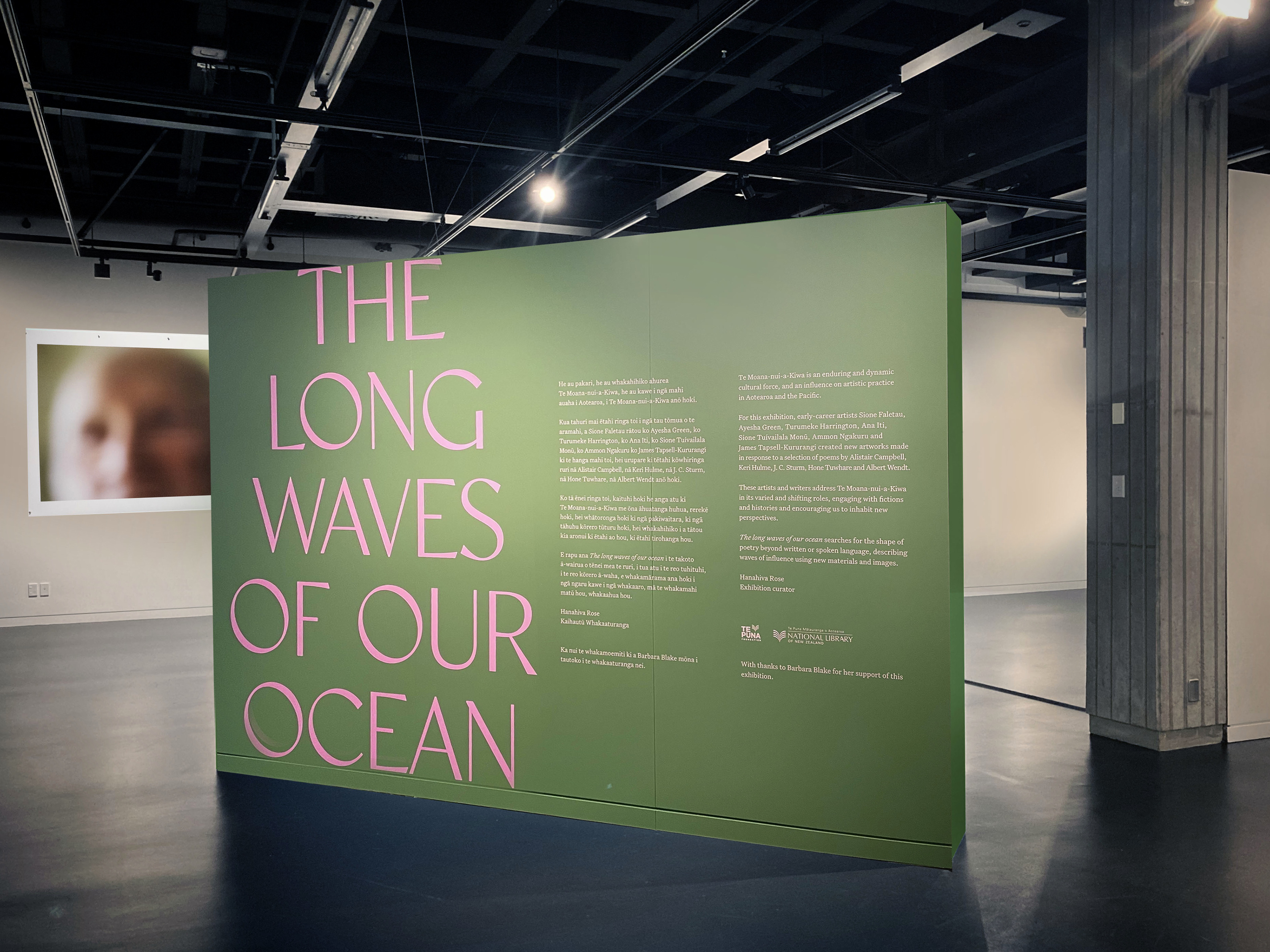 To affirm this artistic response, the exhibition identity typographically references the ocean; the movement patterns of currents rolling across its surface. The exhibition colours were inspired by the vibrance and boldness of tīvaevae, a traditional form of hand-stitched quilting made by Pacific wāhine. Tīvaevae signify a special or important occasion, as well as being a nurturing exemplar of cultural identity.