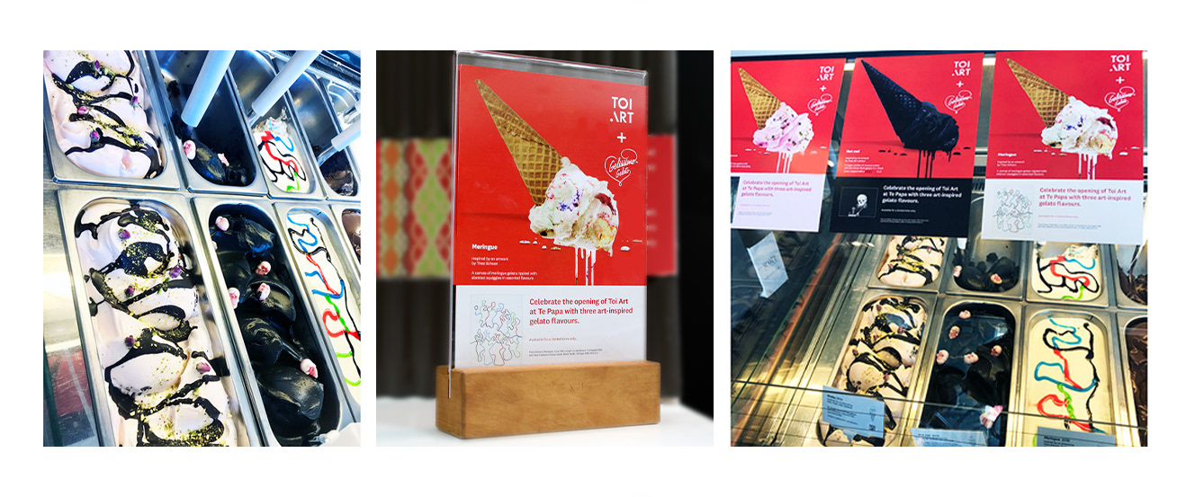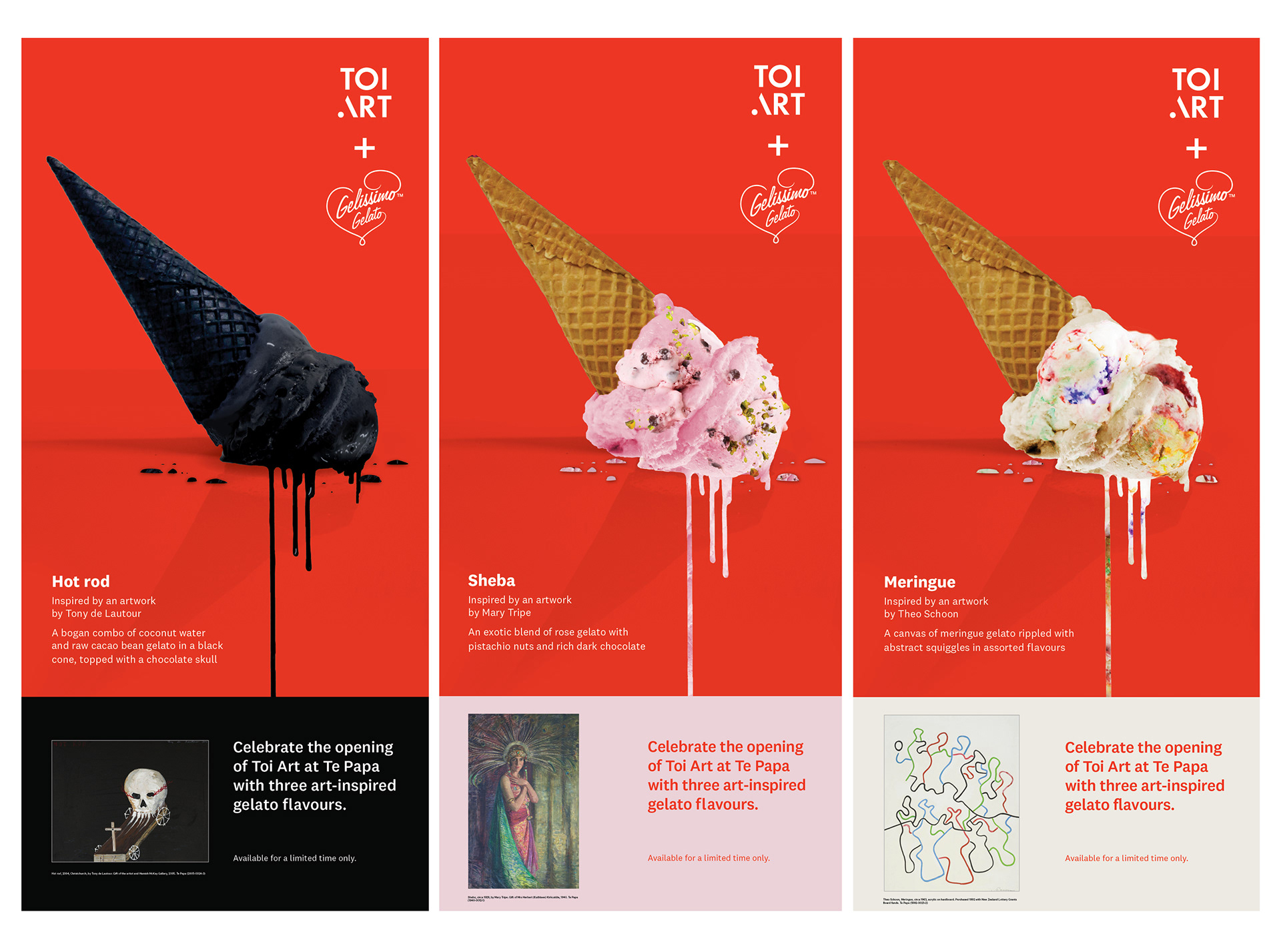 Promotional posters ad labels for Gelissimo and Te Papa collaboration